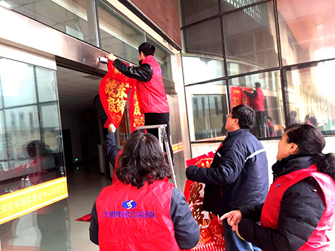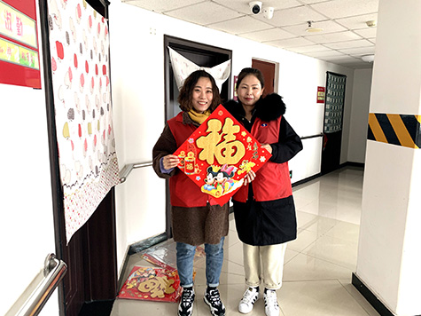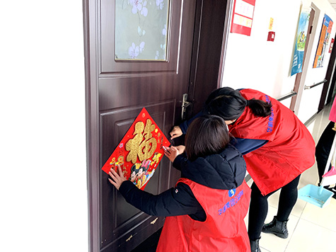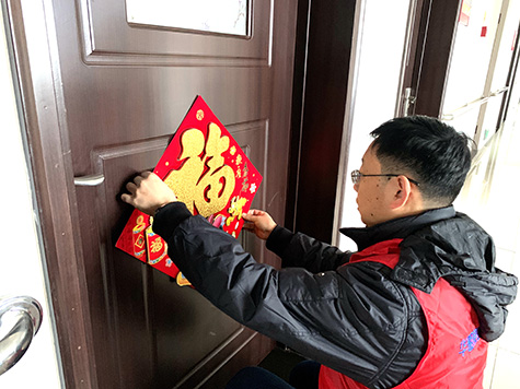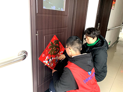 志愿者到達(dá)養(yǎng)老中心后,一個(gè)個(gè)立馬忙碌了起來(lái),有的在一樓大廳張貼充滿(mǎn)春節(jié)氣息的吊錢(qián),有的去往各樓層的老人居室,親手為老人們張貼福字。與此同時(shí)也與老人們親切地拉起了家常,詢(xún)問(wèn)老人們的生活狀況,并向他們致以新春的問(wèn)候。老人們看到志愿者們親手為他們貼上去的福字,喜笑顏開(kāi),對(duì)我集團(tuán)的志愿者豎起了大拇指。一句句溫馨的祝福,一個(gè)個(gè)暖心的笑容,為華明父老鄉(xiāng)親送去春節(jié)的祝福。