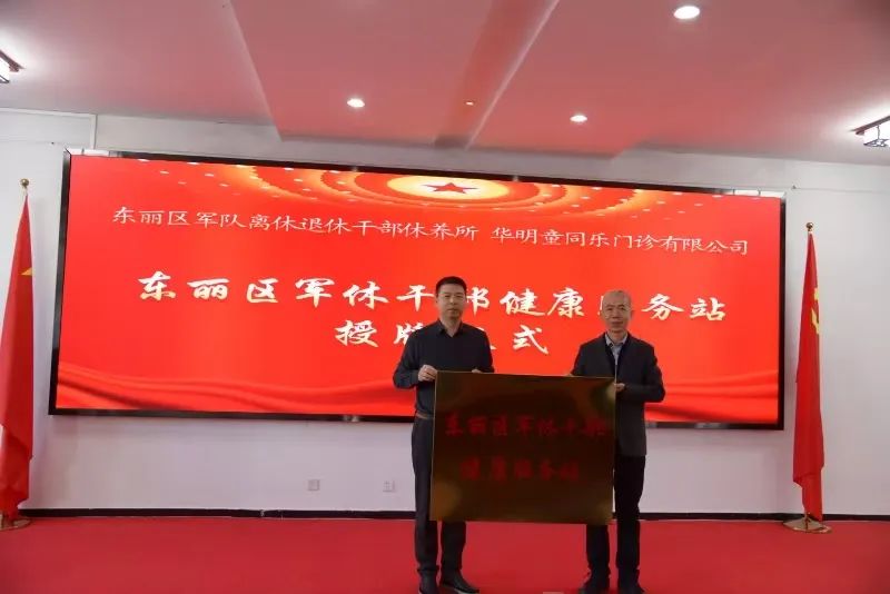東麗區(qū)軍休干部健康服務(wù)站授牌,華明集團(tuán)總經(jīng)理佟功強(qiáng)接受摘牌。