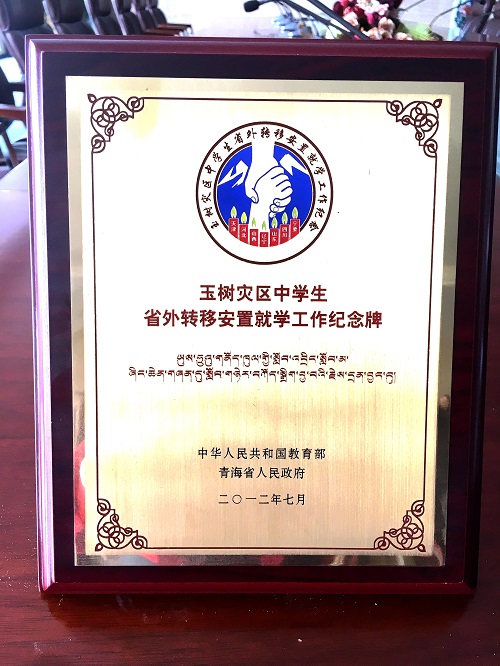 玉樹災區(qū)中學生省外轉(zhuǎn)移安置就學工作紀念牌
