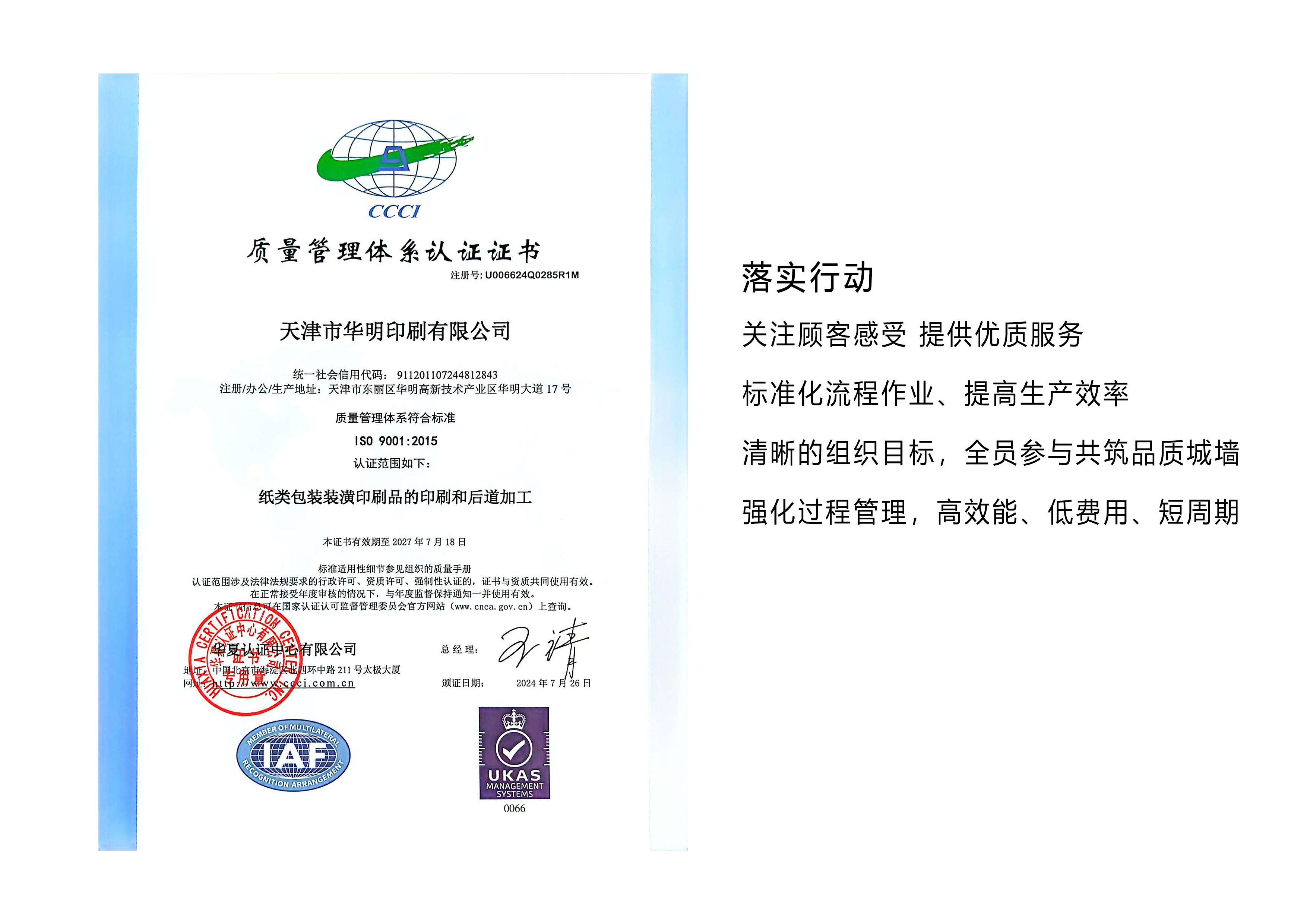 天津市華明印刷有限公司創(chuàng)立于1997年,坐落在交通便利的華明高新區(qū),是一家集研發(fā)設計,印刷及印后為一體的包裝型企業(yè),主要業(yè)務覆蓋醫(yī)療,食品,電子,日化品等諸多行業(yè),我們堅持以客戶為中心,以承擔責任為本,專注于質量和成本,持續(xù)改善,創(chuàng)新發(fā)展,多年來得到眾多客戶的信賴和支持,成為知名企業(yè)的優(yōu)秀供應商和戰(zhàn)略合作伙伴。